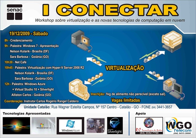 Sábado dia 19/12, eu, Alliston e Kolarik vamos participar do I Conectar – Workshop sobre virtualização e as novas tecnologias de computação em nuvem na cidade de Catalão/GO. Uma iniciativa do SENAC de levar maiores informações sobre as tecnologias Microsoft para Catalão, cidade essa que está em constante crescimento.