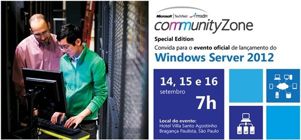 Nos dias 14, 15 e 16/09 a comunidade técnica em massa (IT Pros, Devs e DBAs) compareceu ao Community Zone 2012 Special Edition para acompanhar o lançamento no Brasil do Windows Server 2012 em Bragança Paulista no Hotel Santo Agostinho.