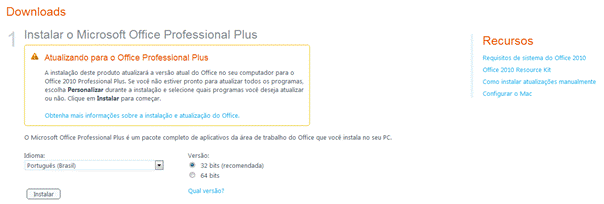 Em recursos do lado direito da figura 5, é possível acessar o link downloads, nessa página de downloads é possível não só escolher a arquitetura (32 ou 64 bits), idioma do office, como também é possível acessar a comunidade Office 365, ler mais sobre os recursos online e já é possível instalar o Lync Online e configurar a área de trabalho para trabalhar com os serviços online do Office 365, essa configuração é realizada para automatizar sign in, verificar updates necessários para o PC funcionar perfeitamente com as ferramentas (conhecido como assistente dos serviços Microsoft Online Services).