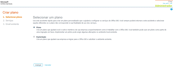 Figura 10 – Wizard inicial para assistente rapido de planos de implantações Office 365