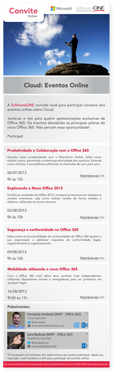 Participe! Ainda, teremos outros dois eventos: https://sarabarbosa.net/2013/07/23/webcast-office-365-softwareone/