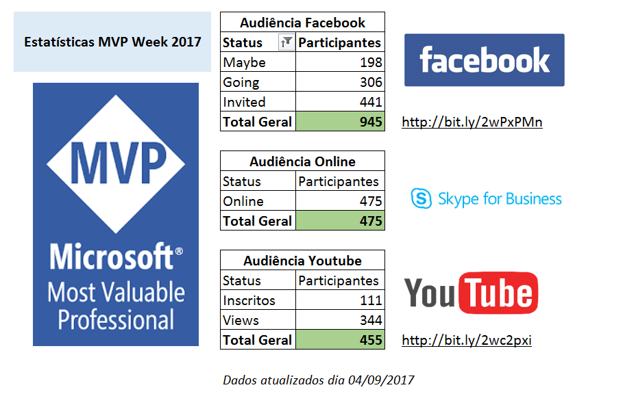 Gostaria de passar para vocês um feedback do que foi o MVP Week 2017 em números, agradecimento e próximos passos. O MVP Week aconteceu na semana dia 21 a 25 de Agosto de 2017, como muitos de vocês acompanharam no evento do Facebook: https://www.facebook.com/events/316648315464161/