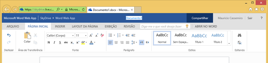 Sabemos que quando estamos editando um documento e precisamos renomeá-lo é necessário fechar o mesmo e acessar o diretório (local ou hospedado em nuvem) em que está o arquivo para realizar a alteração e depois reabri-lo para continuar a trabalhar em seu conteúdo. Com as novas atualizações de janeiro de 2014 para as Microsoft Office Web Apps isso não é mais preciso. Baste que se altere quando quiser (mesmo que o documento esteja em edição) na parte superior da nova interface onde se localizam os títulos dos arquivos/documentos. Veja: