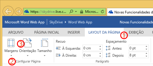 Na demonstração que preparei, gostaria de mostrar como um exemplo prático a ferramenta Orientação> Paisagem. Para quem conhece, esta ferramenta localiza-se tanto no Word quanto no Word Web App na guia Layout de Página e no grupo de opções Configurar Página dentro da Faixa de Opções do Office e do Office Web Apps: